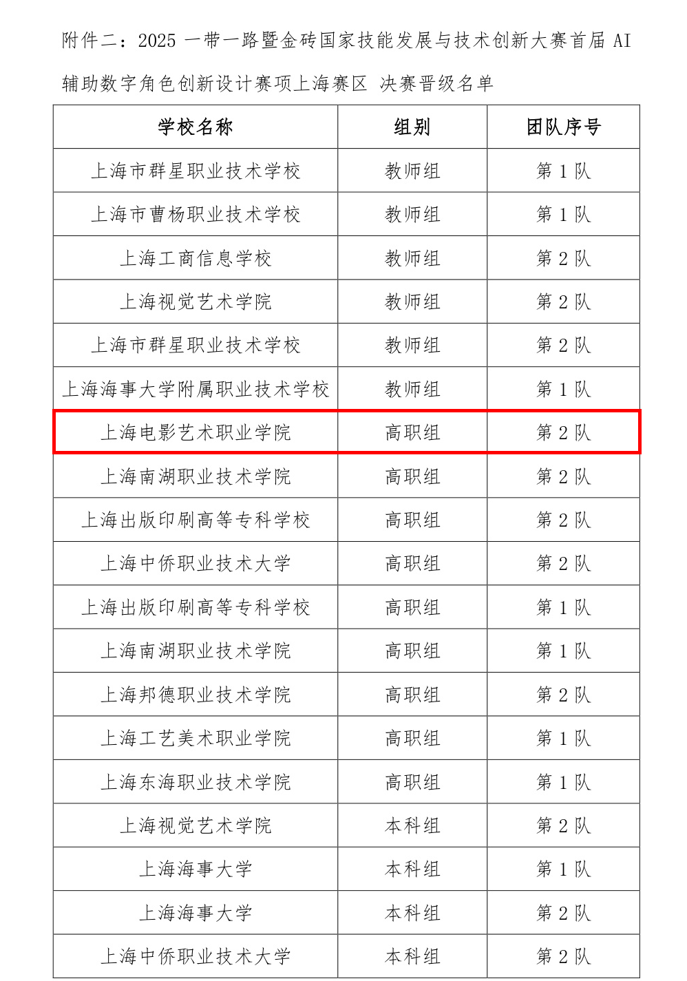在刚刚落幕的2025一带一路暨金砖国家技能发展与技术创新大赛之首届AI辅助数字角色创新设计赛项上海赛区选拔赛中,上海电影艺术职业学院影视科创学院师生团队凭借卓越的创意和领先的AI技术应用能力,一举夺得一等奖,成功晋级全国总决赛!