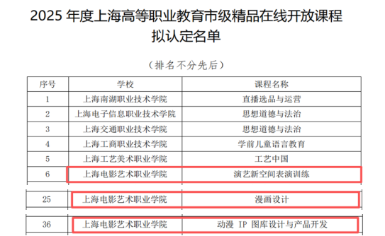 近日,上海市教委公示2025年度高等职业教育市级精品在线开放课程拟入选名单,我校《动漫IP图库设计与产品开发》《演艺新空间表演训练》《漫画设计》三门课程成功获批2025年度市级精品在线开放课程立项。目前,学校已经拥有国家级(在线)精品课程1门、市级精品(在线开放)课程8门。