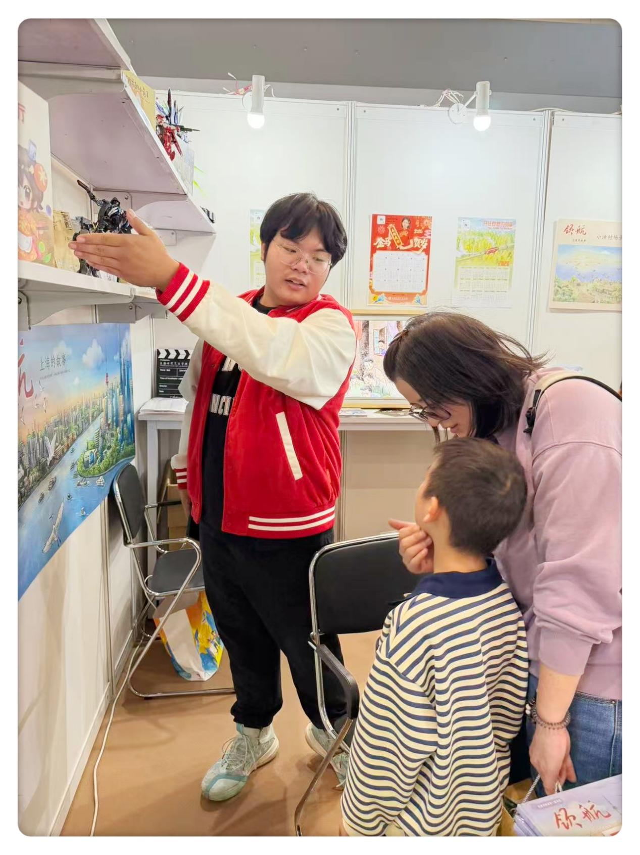 数字板绘体验区同样热闹非凡,此次参展的部分项目组同学全程参与布展与现场互动,在他们的悉心指导下,小观众们纷纷拿起画笔,亲自体验AI辅助创作的奇妙乐趣。陪同的家长表示:“这种互动既有趣又有教育意义,让孩子对科技和艺术产生了浓厚兴趣。”手办艺术涂装项目组陈列的高达改件手办模型,也吸引了国内外动漫爱好者与出版界人士驻足交流、拍照留念,不少国际参观者主动询问合作可能性,为后续国际合作埋下伏笔。值得一提的是,学生们在与观众面对面的互动中,不仅锻炼了社会实践能力,更直观了解了市场需求与大众审美,为后续创作积累了宝贵的实战经验。