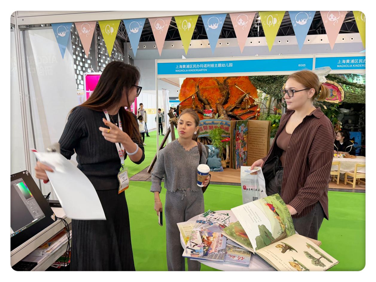 展会现场的互动体验环节人气爆棚,展位化身为充满未来感的数字艺术体验空间,吸引了众多亲子家庭、专业观众及国际友人驻足。VR体验区前排起长队,孩子们戴上VR设备后仿佛瞬间穿越到了绘本《领航:上海的故事》所描绘的隋朝上海,瑰丽景色让孩子们不时发出惊叹,欢笑声此起彼伏;来自法国、日本的童书出版商也专程体验,对VR技术与绘本内容的创新融合表示高度认可,直言“这种沉浸式表达为童书创作开辟了新路径”。