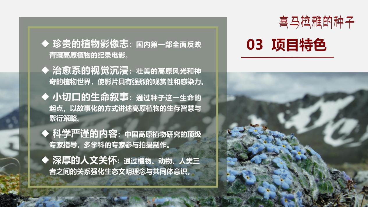 该影片由创作团队历时三年艰苦拍摄,跨越青藏高原多个海拔梯度,系统跟踪记录50多种高原特有植物的生命轨迹。从海拔6300米的雪兔子棉毛恒温系统,到马先蒿精准传粉的几何美学;从滇金丝猴与冷杉林的生态共生,到人类与青稞的千年之约,影片以超高清影像解构植物的进化历程。该片不仅是一部展现自然奇观的科学纪录片,更以沉浸式视听体验传递出生命共生、生态守护与适应演化的深刻主题,打造出一部融合科研价值与人文关怀的视觉史诗。