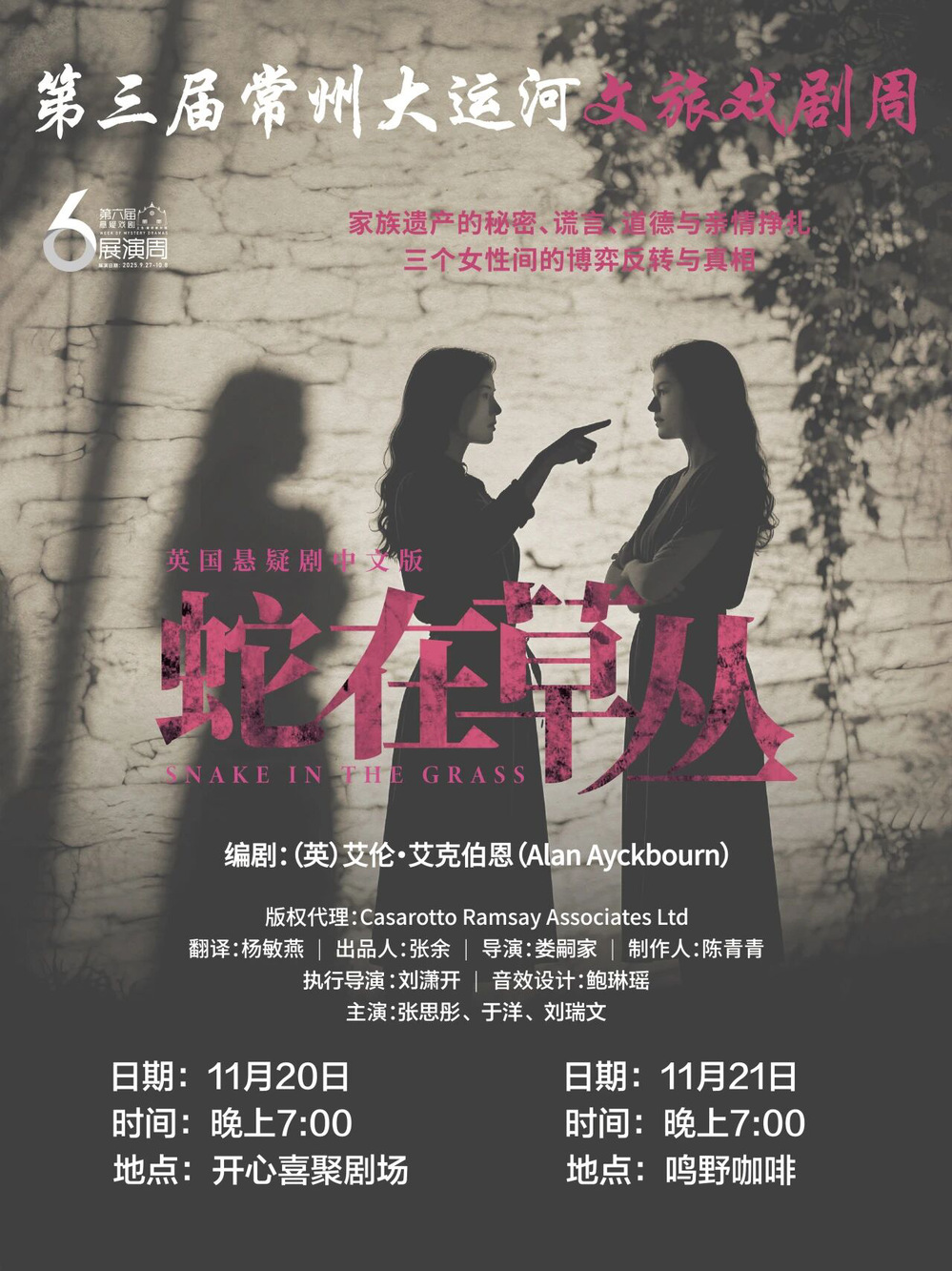 上海电影艺术职业学院演艺学院联手现代人剧社,打造了演艺新空间戏剧《蛇在草丛》,本部作品由戏剧影视表演专业教师娄嗣家老师导演,于11月20日至21日在常州开心喜聚剧场&鸣野咖啡成功上演。由戏剧影视表演专业学生张思彤、于洋、刘瑞文出演;刘潇开、鲍琳瑶参与。演出现场观众掌声不断,好评连连。