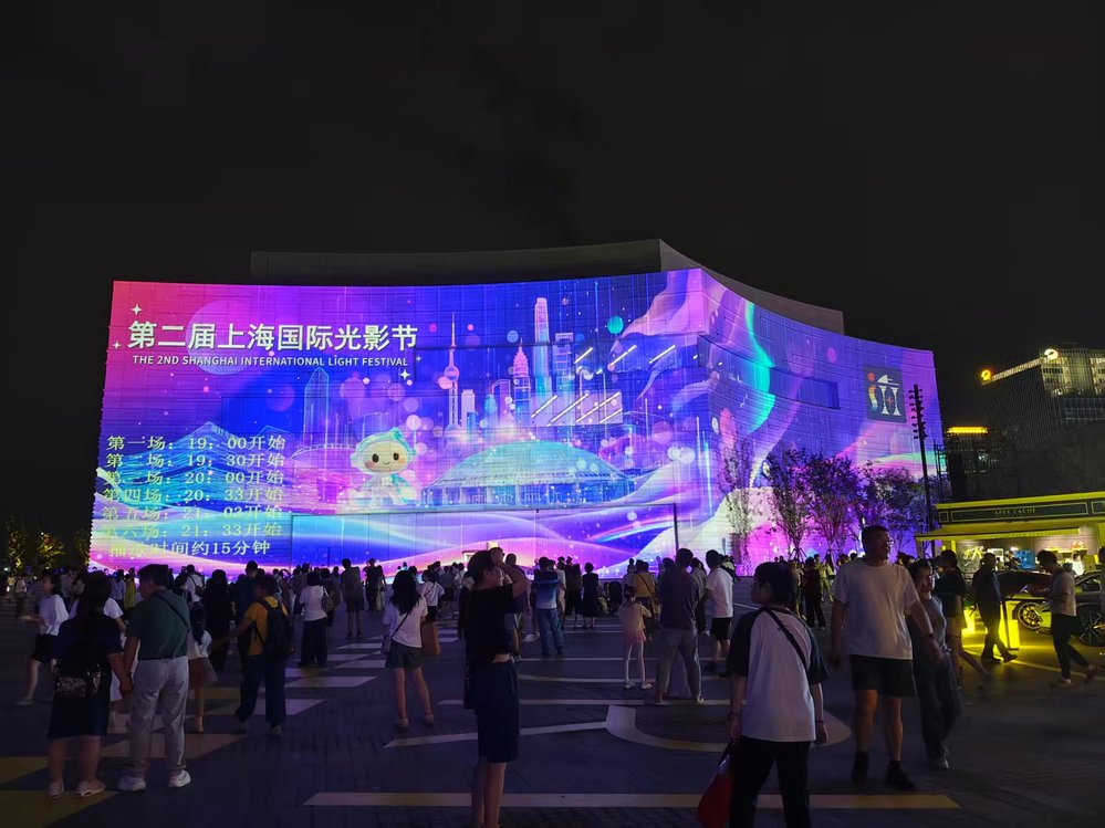 现场,“星空与银河” 主题投影吸引大量市民驻足:学生通过数字艺术手法,将上海夜空下的银河轨迹与西岸大剧院建筑肌理结合,辅以动态光影流转效果,科技感与艺术性兼具。技术实现中适度运用 AI 优化光影参数,让 “星河倾泻”“星光闪烁” 的视觉效果更显细腻,成为光影节中诠释 “数字上海” 魅力的亮眼。