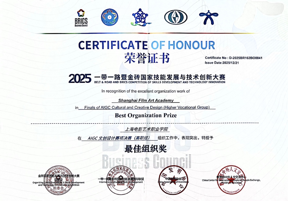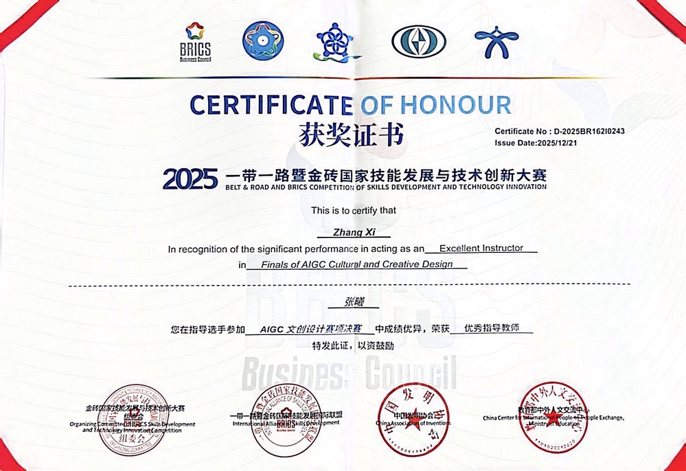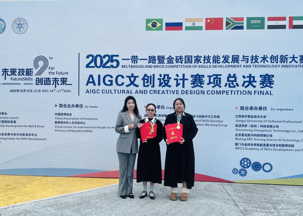 2025年12月21日,2025一带一路金砖国家技能发展与技术创新大赛“AIGC文创设计”赛道全国总决赛落幕。我校广告专业学生吕佳宇、王丽蓉历经区域赛、国赛、路演三轮严苛选拔,斩获各阶段一等奖,最终在全国总决赛路演环节卫冕高职组全国一等奖,强势入选“金砖未来技能人才库”。作为本次大赛中唯一获此殊荣的上海高职院校,充分彰显了我校广告专业在AI赋能文创设计领域的教学实力与技术优势。