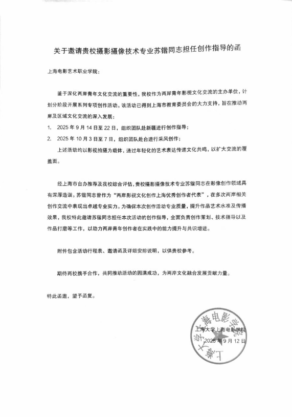 本次联合创作是高校以文化创作服务国家战略、以影像交流促进青年融合的生动实践。未来,上海电影艺术职业学院将继续依托“一带一路”合作框架,拓展两岸青年联合创作的主题与形式,通过持续举办专题创作、技术培训与作品展映活动,为构建“一带一路”人文共同体贡献教育力量。