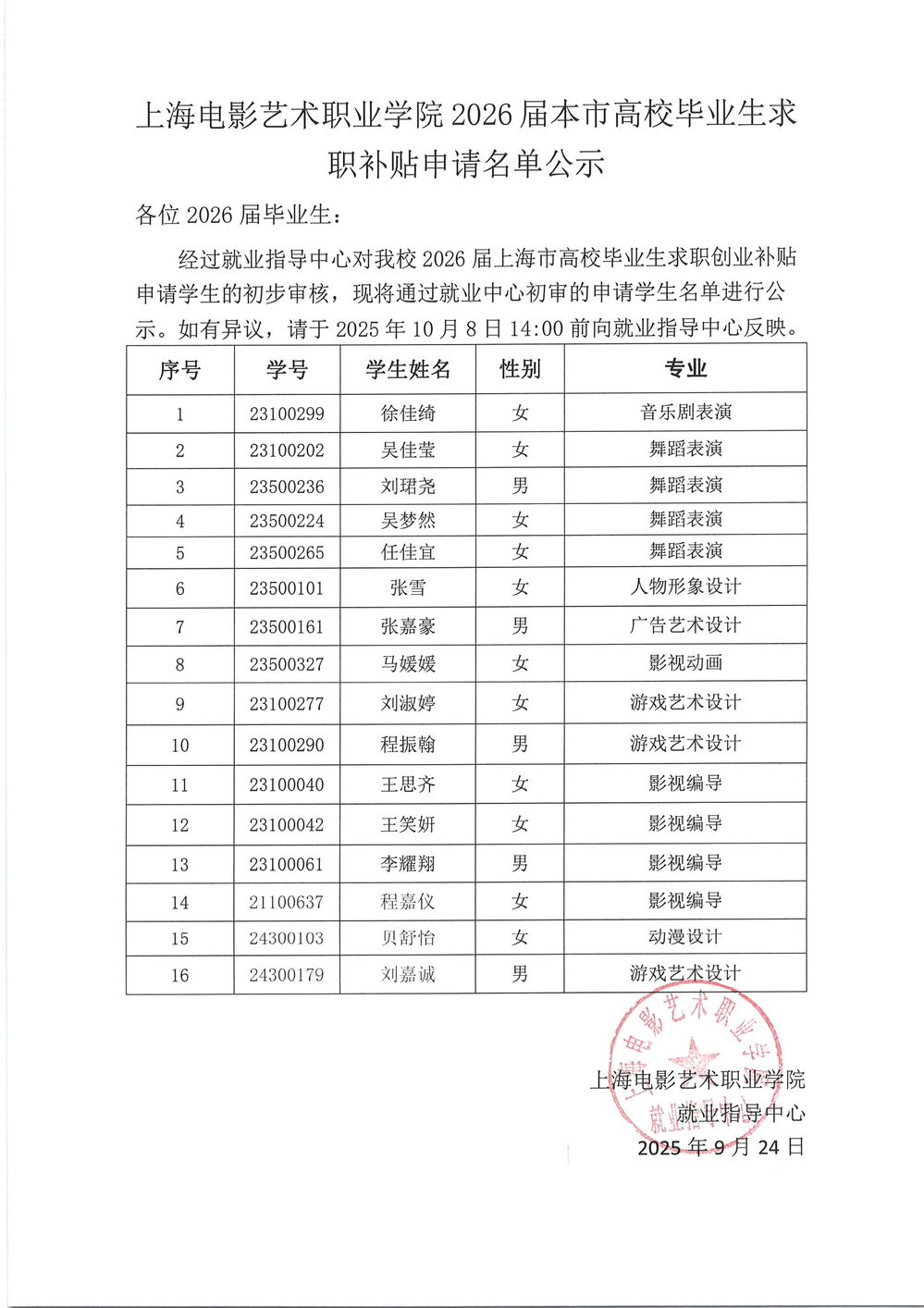 2026届本市高校毕业生求职补贴申请名单公示